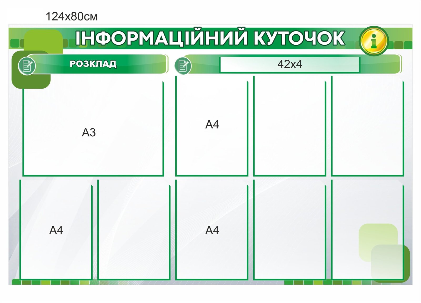 Для змінної інформації встановлюються прозорі кишені з ПЕТ-пластику, які відзначаються довговічністю,